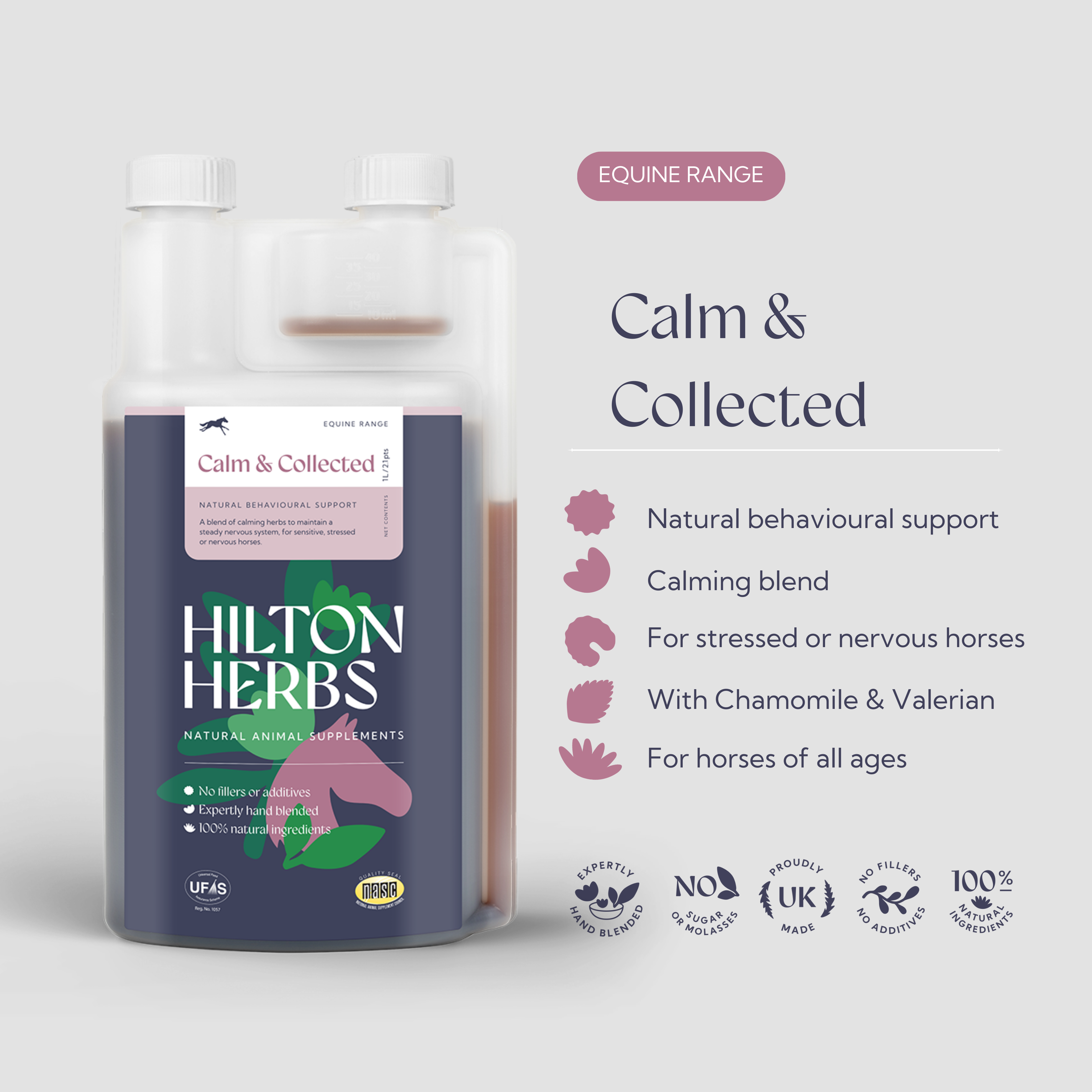 Made from natural ingredients, Calm & Collected contains calming herbs such as Chamomile and Valerian, which are known for their soothing effects on the nervous system. It is suitable for horses of all ages and can be a valuable part of a routine to promote overall emotional well-being.