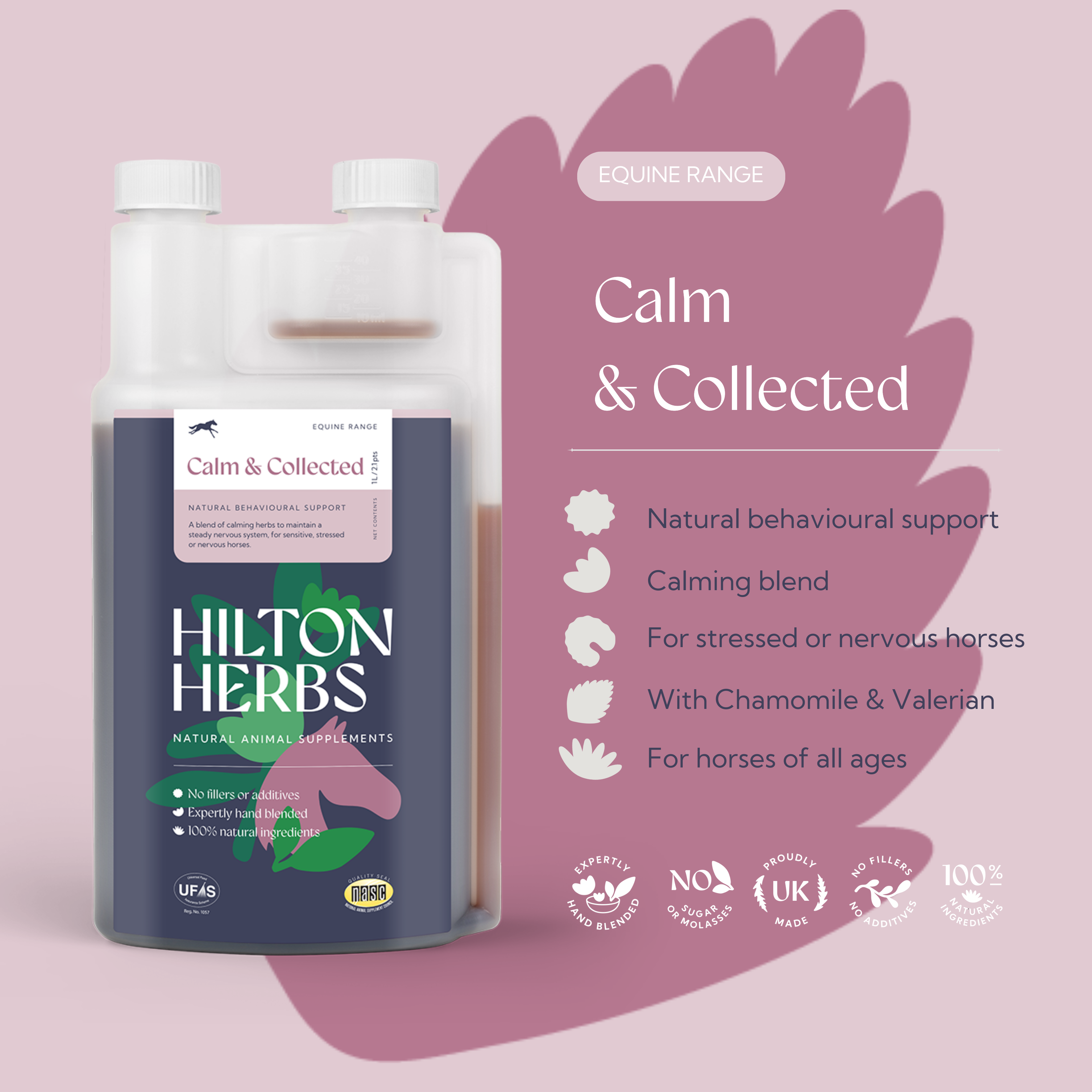 Calm & Collected Liquid for horses, ponies, and donkeys is specially formulated to help maintain and support a calm and balanced nervous system. It is ideal for young horses undergoing schooling, as well as for anxious horses that are on restricted turnout or receiving minimal exercise. This supplement also supports horses that are adjusting to a new environment, helping them settle in more comfortably.