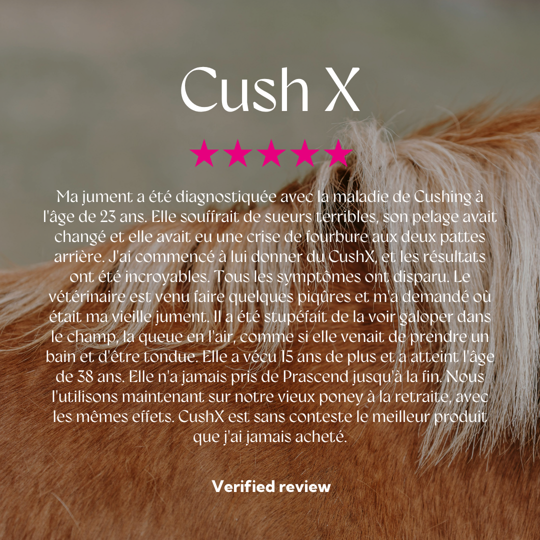 With key ingredients like Vitex Agnus Castus (Chasteberry) and Milk Thistle Seed, Cush X Liquid works to encourage normal coat shedding and assist in temperature regulation, while also promoting healthy circulation, kidney and urinary tract function. Its natural composition supports your equine companion’s energy levels and helps them feel more comfortable and content throughout seasonal changes. Ideal for horses needing gentle hormonal support, Cush X Liquid offers a reassuring, holistic approach to maintaining balance and wellness inside and out.