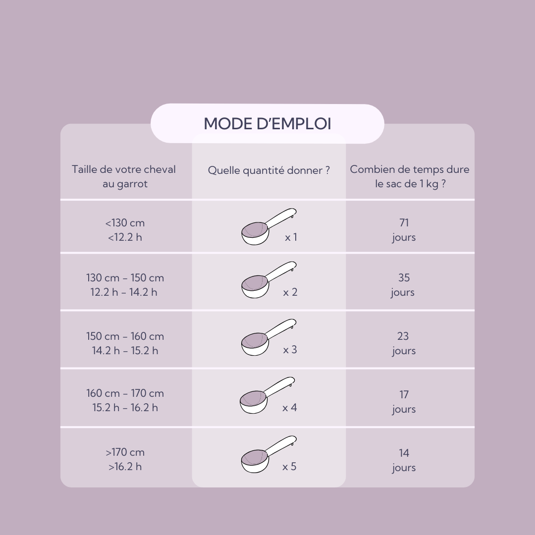 Ajoutez à la ration quotidienne, lorsque cela est possible, donnez-en deux fois. Une mesure de 50 ml est présente dans chaque pack et les instructions d'utilisation se trouvent sur l'emballage. Un mois peut être nécessaire à l’apparition de tous les bienfaits des plantes. Aliment complémentaire pour équin. Les informations sur les plantes et principes actifs sont données à titre indicatif.