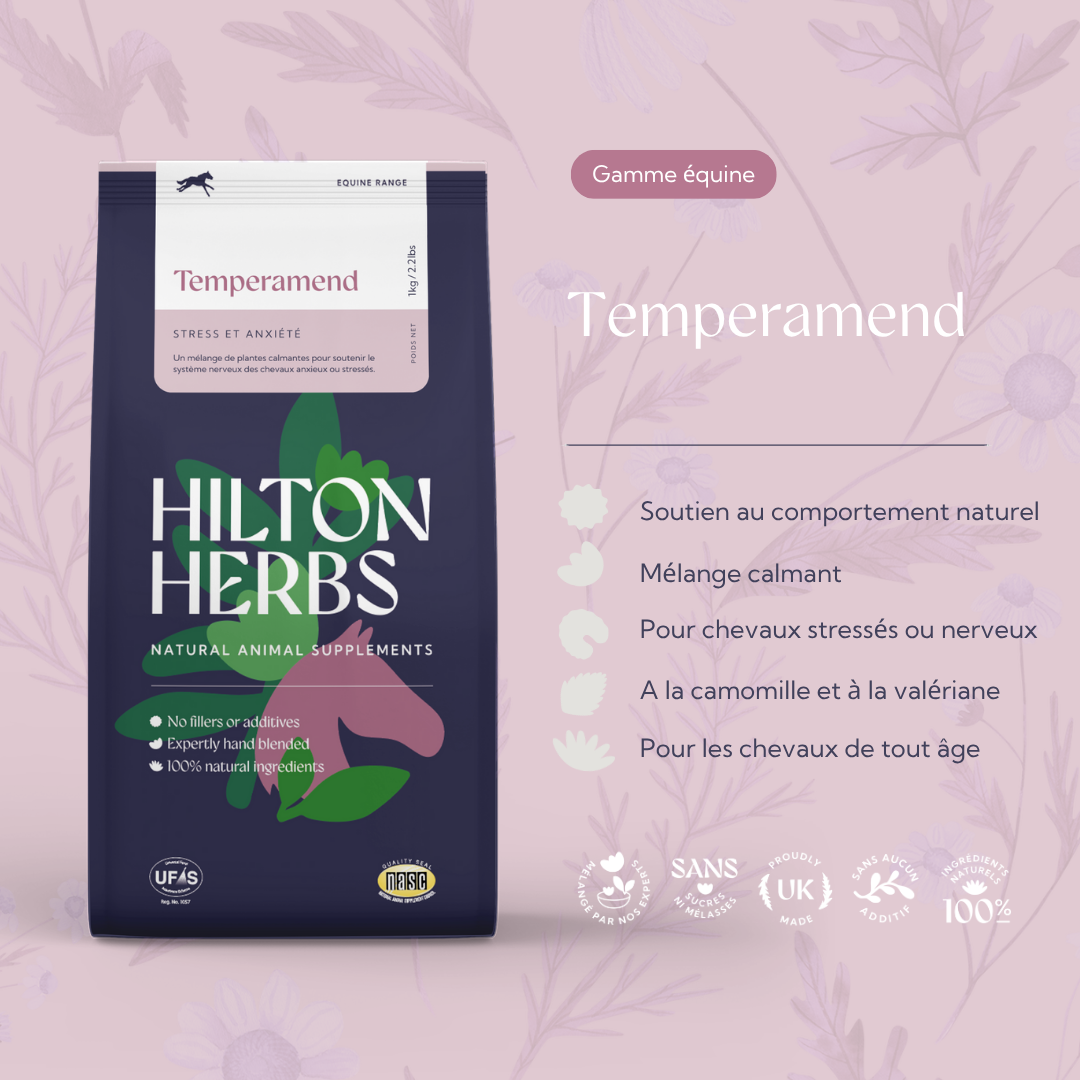 Temperamend est un complément alimentaire naturel à base de plantes séchées, formulé pour aider à maintenir un système nerveux calme et équilibré chez les chevaux, les poneys et les ânes. Grâce à un mélange de plantes douces et apaisantes telles que la camomille et la valériane, il apporte un soutien efficace aux chevaux sujets à l'anxiété, à la tension ou aux comportements liés au stress.