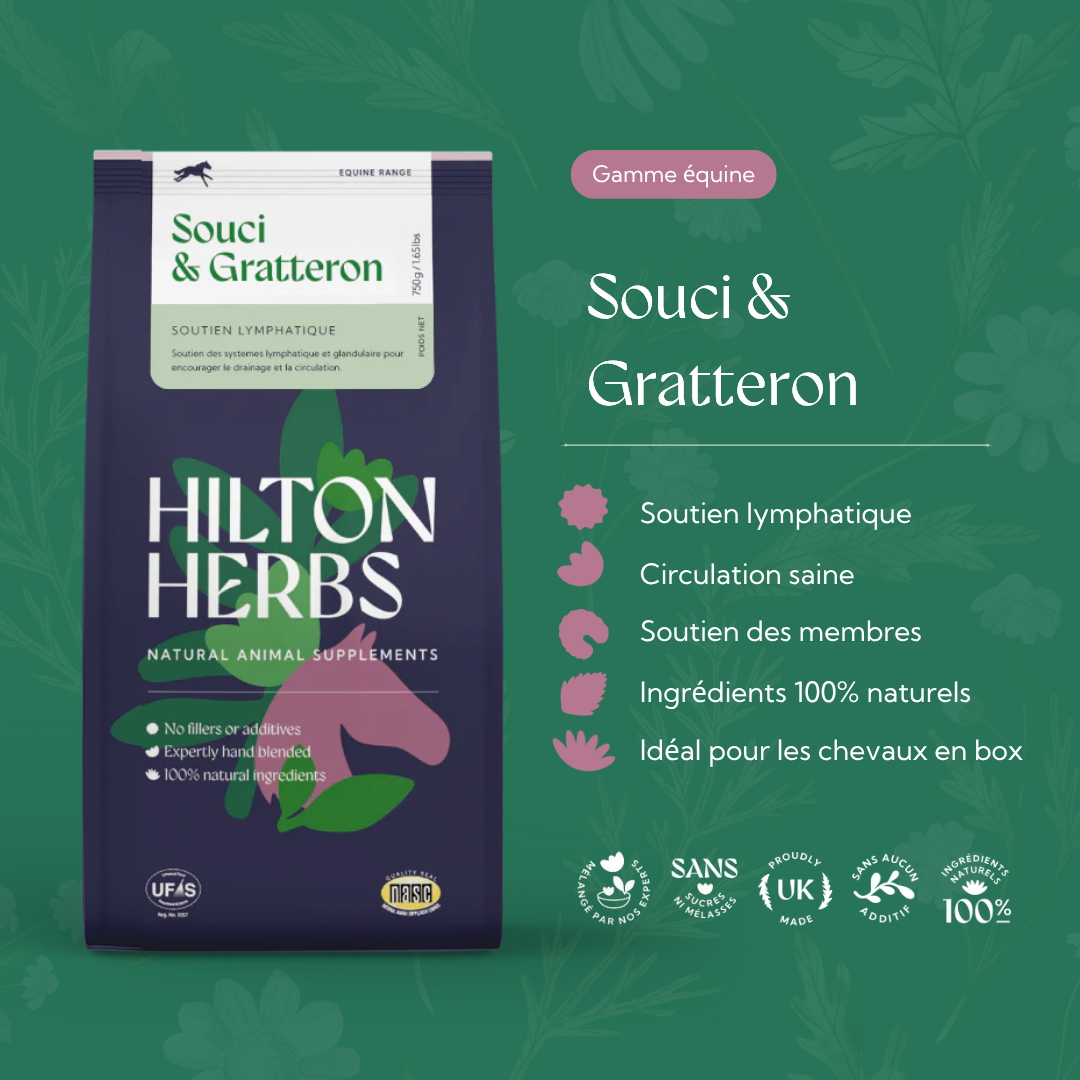 Ce mélange est particulièrement bénéfique pour les chevaux en stabulation ou âgés, surtout lorsque leur sortie est limitée et qu'ils ont tendance à avoir les pattes gonflées ou enflées. Il aide à maintenir une circulation lymphatique saine, à soutenir l'intégrité des tissus mous et à gérer la rétention d'eau. Souci & Gratteron est également un choix idéal pour les chevaux souffrant de troubles tels que le CPL (lymphœdème chronique progressif), pour lesquels il est essentiel de soutenir le drainage lymphatique et la santé des tissus.