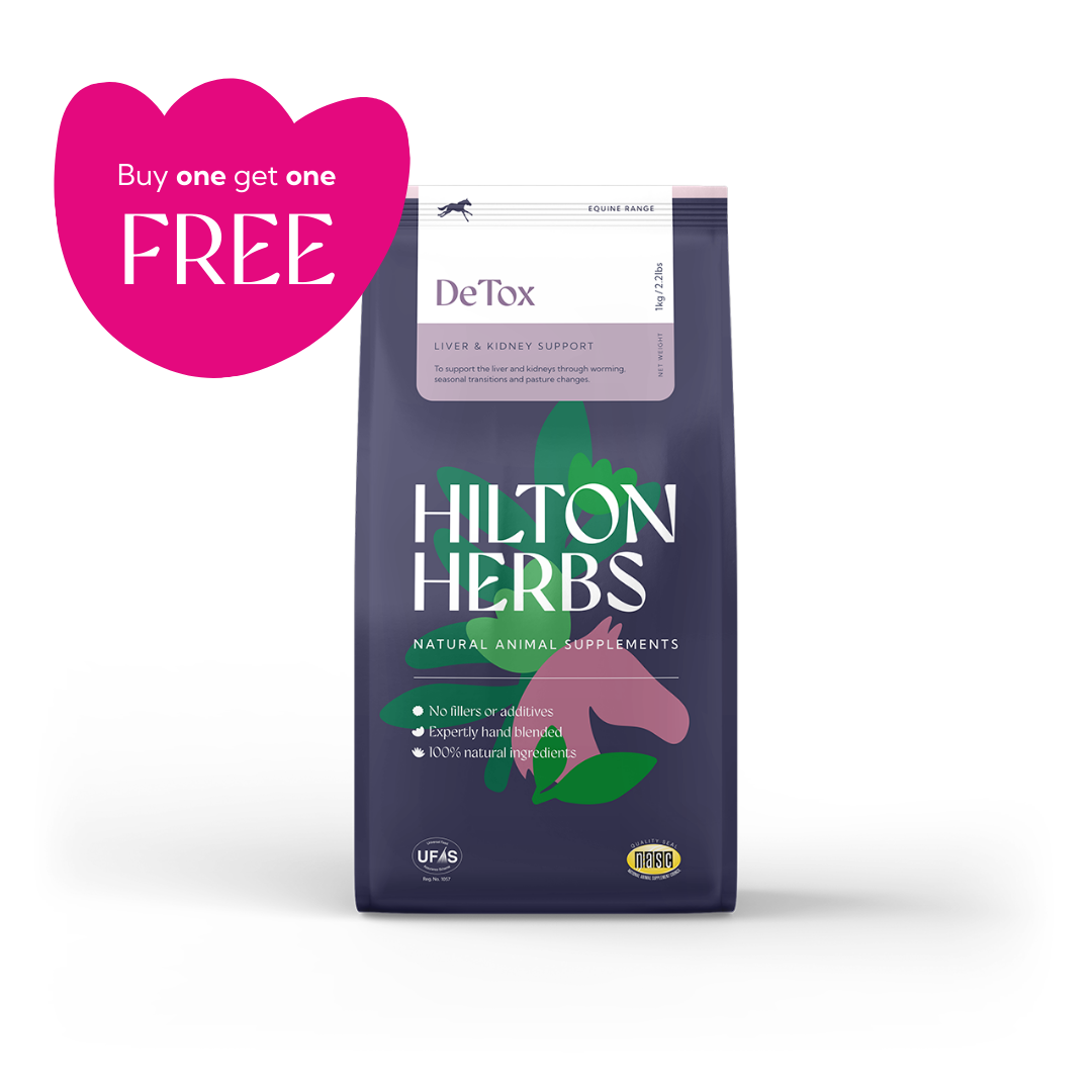 DeTox is a natural herbal supplement formulated to support healthy liver and kidney function in horses, ponies, and donkeys. These vital organs play a central role in processing and eliminating toxins from the body, and DeTox helps ensure they continue to function efficiently, especially during times of increased metabolic demand or environmental stress.