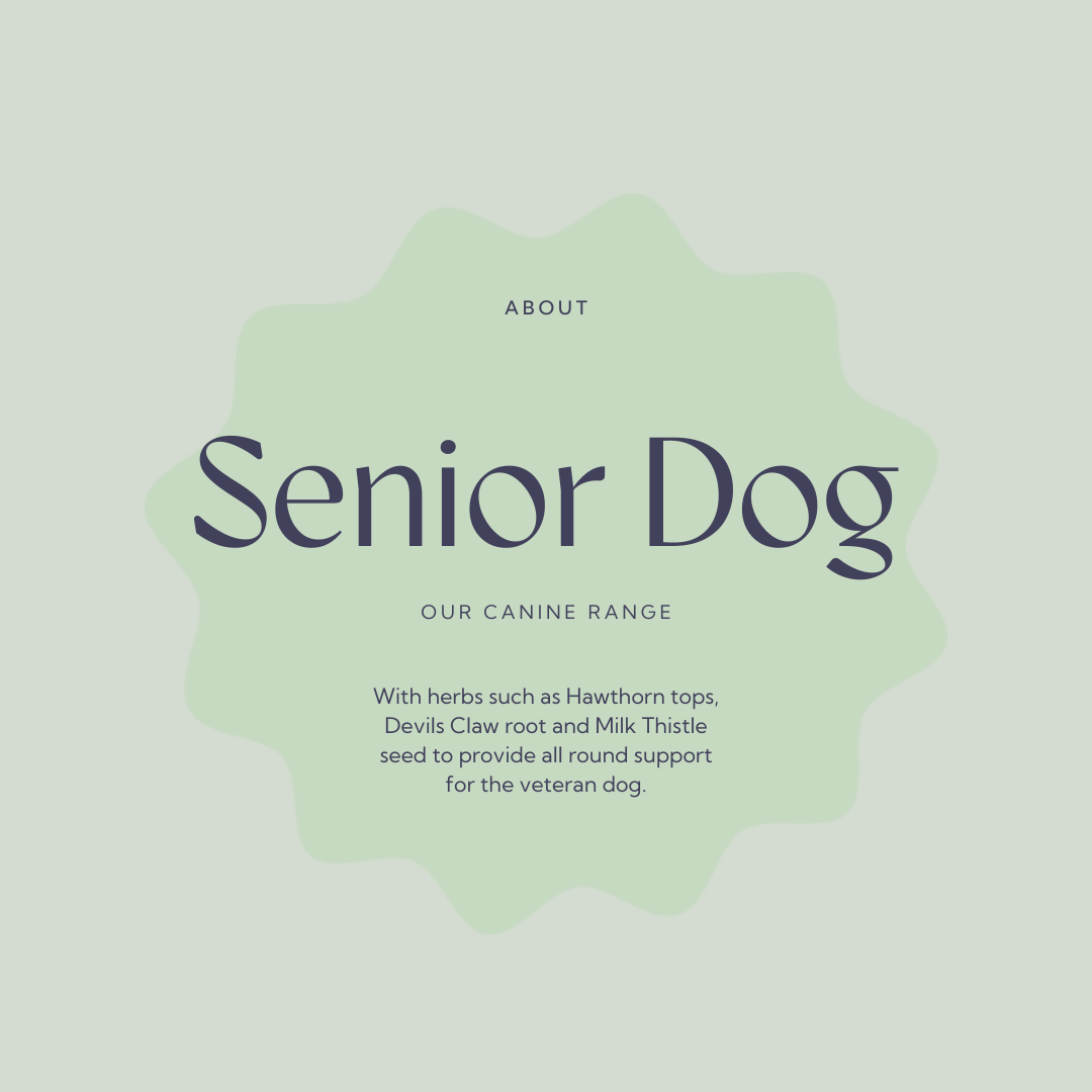 Senior Dog is a fine cut dry supplement containing herbs such as Hawthorn tops, Devils Claw root and Milk Thistle seed to provide all round support for the older dog. It's liquid equivalent, Senior Dog Gold, could be used initially due to its quicker absorption.