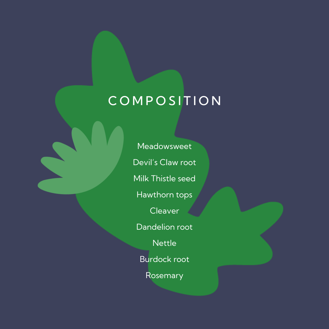 Meadowsweet, Devils Claw root, Milk Thistle seed, Hawthorn tops, Cleaver, Dandelion root, Nettle, Burdock root, Rosemary.